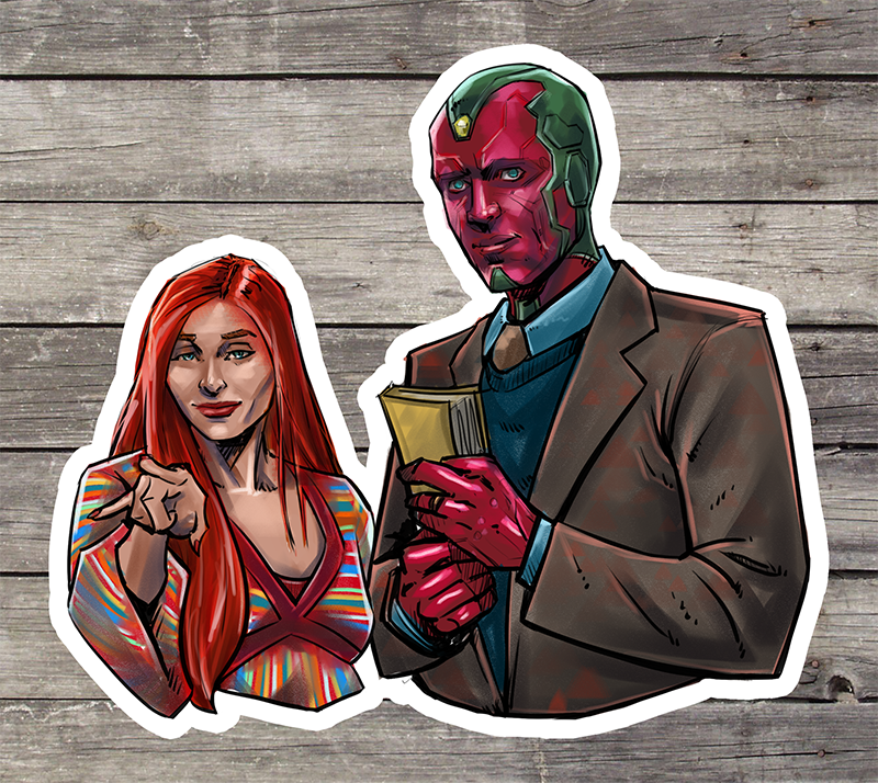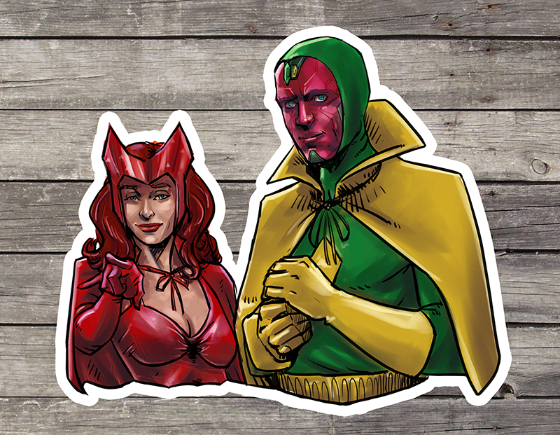 I loved Wanda Vision and made these stickers inspired by two of my favorite outfit sets, especially the comic accurate costumes. These stickers are 5" wide, and look great everywhere (probably!).